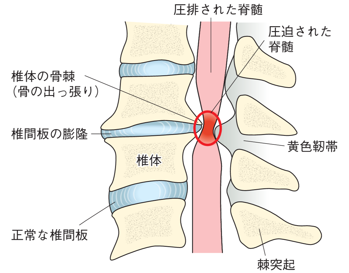 頚椎症性脊髄症は、加齢性変化によって頚部の脊柱管が狭くなり、そのなかにある脊髄が圧迫され、進行すると四肢の運動麻痺や感覚障害を引き起こす疾患です。