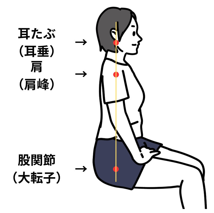 耳たぶ(耳垂)→肩(肩峰)→股関節(大転子)この3つが一直線になっていることが、横から見た時の良い姿勢の基準となります。
