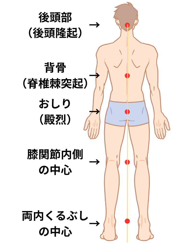 後頭骨(後頭隆起)→背骨(脊椎棘突起)→おしり(殿烈)→膝関節内側の中心→両内くるぶしの中心