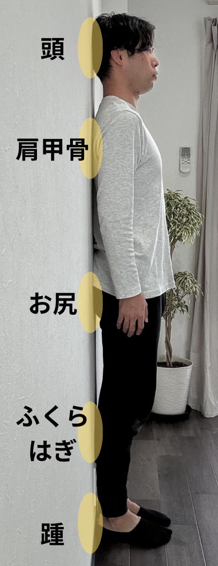 • かかと、ふくらはぎ、お尻、肩甲骨、後頭部の5点を壁にピタッとつけます。